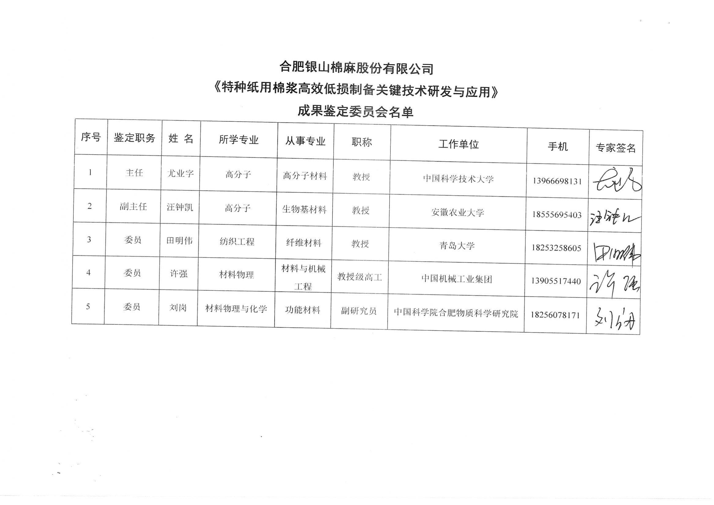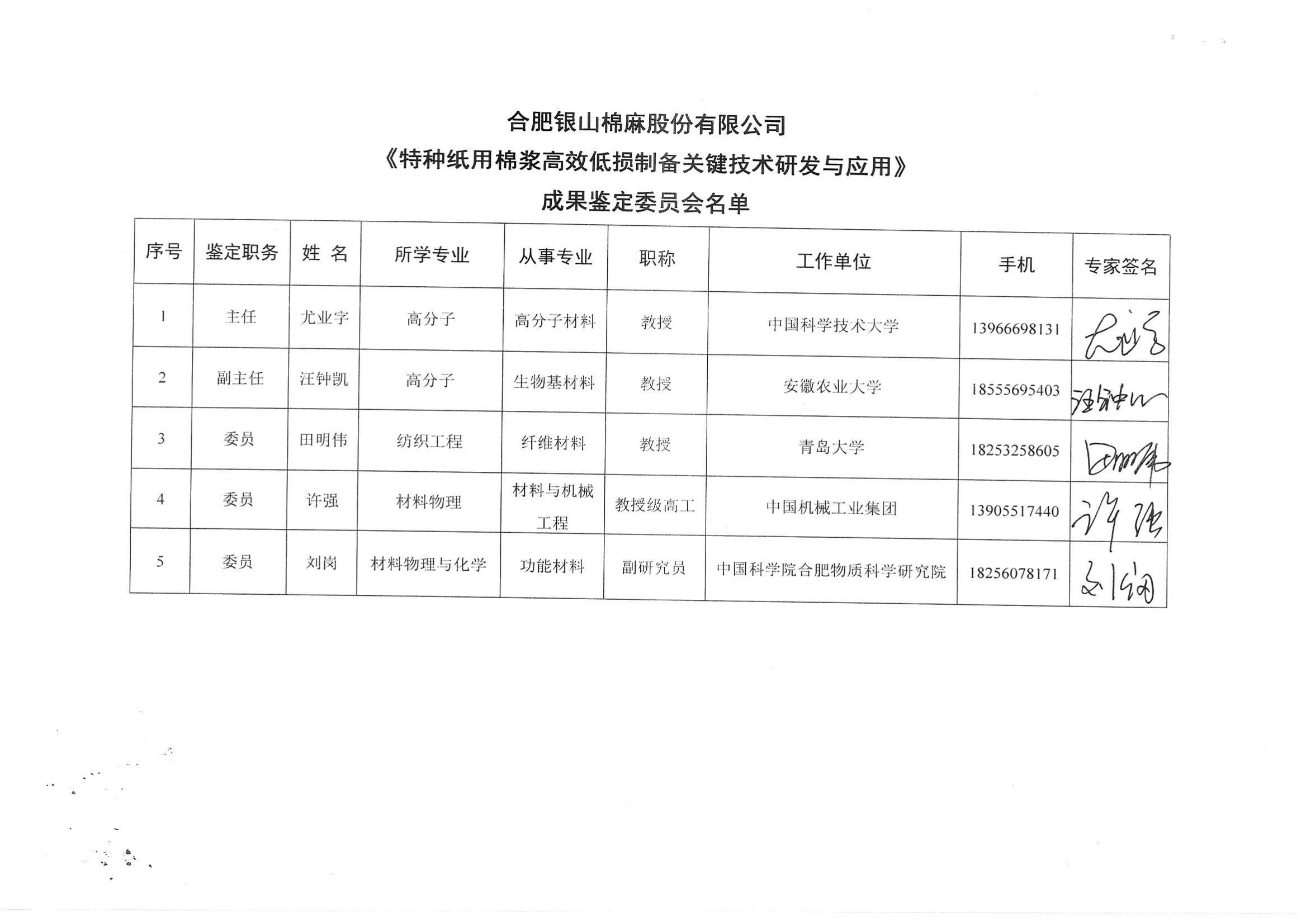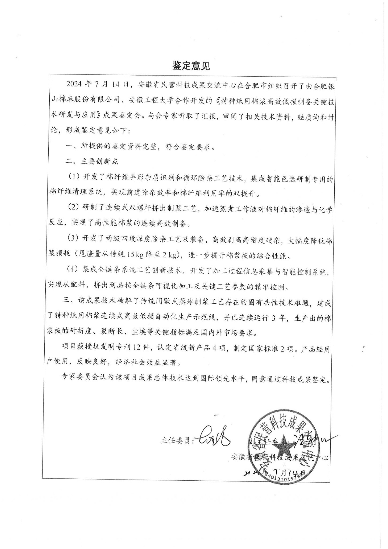 2024年7月14日,安徽省民营科技成果交流中心在合肥市组织召开了由合肥银山棉麻股份有限公司、安徽工程大学合作开发的《特种纸用棉浆高效低损制备关键技术研发与应用》成果鉴定会。
