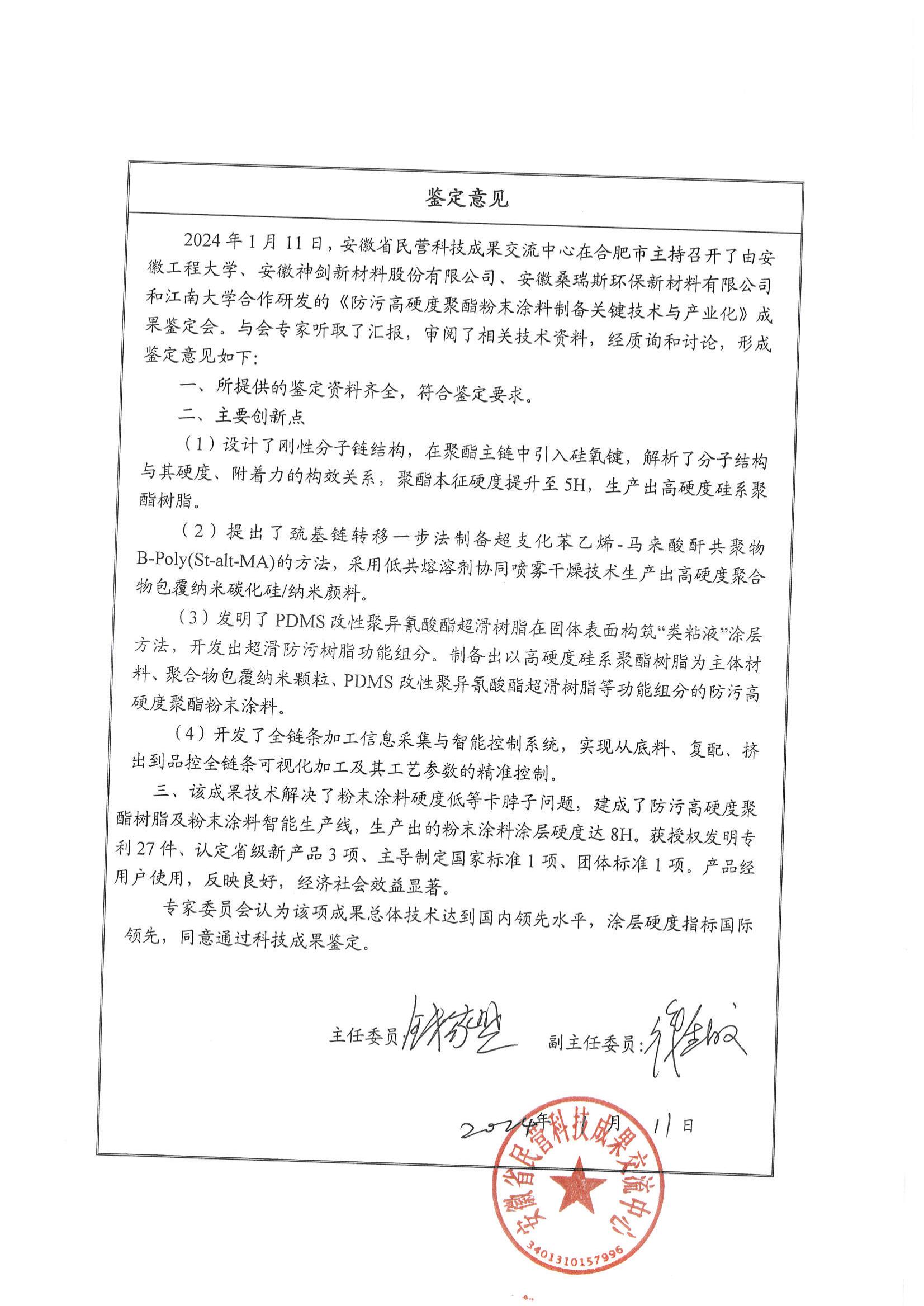 2024年1月11日,安徽省民营科技成果交流中心在合肥市主持召开了由安徽工程大学、安徽神剑新材料股份有限公司、安徽桑瑞斯环保新材料有限公司和江南大学合作研发的《防污高硬度聚酯粉末涂料制备关键技术与产业化》成果鉴定会。